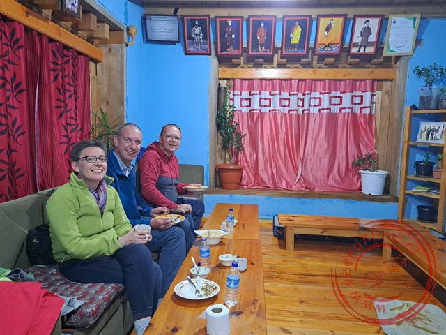 Either eat at the hotel restaurant, which is a similar buffet as yesterday, or eat at a farmhouse in Gangtey. The latter seems the most fun for all three of us. At seven o’clock, we drive to the farmhouse. Outside, darkness has fallen, and without street lighting, it is dark on the road. Gelle steers the car around a cow lying on the road. Carefully, he continues driving. We stop at a homestay. "I have sometimes stayed here with guests," Rinchen says. The lady of the house is already waiting for us at the door. Fortunately, the wood stove is burning inside. Outside, the temperature is just above freezing. Especially Rinchen and Gelle hurry to the stove. Their sleeping quarters have no heating. Meanwhile, tea is served. A buffet of various Bhutanese dishes appears on the table: rice, meat, vegetables, and of course emu datshi. The owner says that last year, the potatoes yielded little. They only got 200-250 rupees per sack, about two to two and a half euros. For transport to India, they already paid 150 rupees per sack. After the meal, the owner brings a bottle of ara, a locally brewed drink. Like in the first homestay, we taste a little. Fortunately, the alcohol strength is manageable here as well. We thank them for their hospitality and drive back to the hotel. This experience was much nicer than dining at the hotel.
