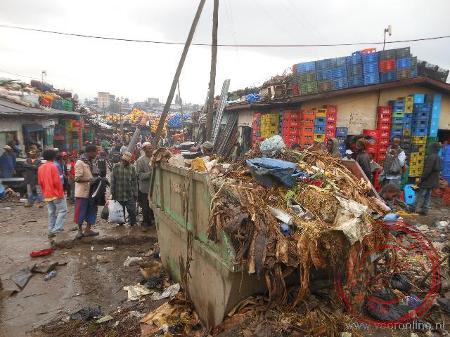 From the Entoto Mountains, I have a beautiful view of the city. Millian takes me to the house of Menelik II. I view the former reception hall and the sleeping quarters. The nearby Entoto Maryam Church, also commissioned by Menelik II, is not accessible. Around the colorful octagonal building, several people pray at the door. In a second small church, there is a small museum about the Menelik period. The local guide leads me around and keeps a close eye to make sure I pay attention. “Next!” he calls out emphatically as he moves to the next display case for his explanation. Many eucalyptus trees grow on Entoto Mountain. These trees grow quickly and provide a lot of wood, which is used for fuel in the city. I see elderly women carrying large bundles of wood down the mountain—a heavy load. Others use donkeys to transport the wood. After lunch in the city center, the tour continues to the Mercato. Around this open market are countless stalls. The streets are crowded. From the bus, I look at the market. I see entire stalls full of jerrycans—an unusual sight. The jerrycans are stacked high on the roofs of the stalls.