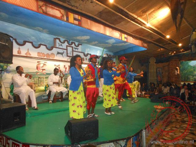 A little further along, I see old barrels. I get the impression that almost anything can be obtained here. Various vendors try to sell their goods to the bus passengers, while others ask more directly for money or pens. In the afternoon, I return to the hotel. I stroll along Africa Avenue, a busy street with larger shops. Because of sewer work, the sidewalk is open. I navigate between stones and water channels and reach a shopping center. I go inside. Passing through luxury shops, a small casino, and a youth arcade, I arrive at a café on the third floor. I order a beer on the outdoor terrace. In the evening, I attend a traditional dance evening with dinner. The restaurant is busy. To my relief, I see mostly Ethiopians and hardly any tourists. I have injera, a type of pancake made from teff grain. On top, I scoop various dishes from the buffet. Following Ethiopian custom, I eat the dishes with a piece of injera each time—of course, using my hands, as Ethiopians do not use cutlery. While drinking the local honey wine, Tej, I enjoy the dance performance.
