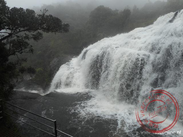From here, it’s still several kilometers to the real World’s End. The canyon here must be three times as deep. I don’t expect a view either. As I reach World’s End, it slowly begins to dry. I meet German and Israeli tourists walking the route the other way. They warn me that the path near Baker’s Fall can be treacherously slippery. Three Chinese girls ask if they can join me. They’re apprehensive about the slippery parts but want to complete the route. They’re from the Beijing area. Together, we walk toward Baker’s Fall. In some areas, rainwater has taken over the entire path. I carefully try to stay on the edges to continue. Fortunately, it’s dry. The Baker’s Fall waterfall is impressive. Due to the heavy rainfall in recent days, the water cascades down with enormous force. On the viewing platform, I get wet from the splashing water. The power of the water here is incredible. I walk back to the visitor center. As I approach, local youths in groups come toward me. They’re just starting their hike. Some are from Colombo and are here for the weekend. A group of over a hundred students is also going on the walk. Most are only wearing shorts and t-shirts and visibly cold. Others wear Santa hats to keep warm. I doubt they’ll enjoy it much, especially since it’s starting to drizzle again. Quickly, I head into the visitor center. I order a cup of instant noodles. Nice and warm. It takes me three hours to complete the circuit. In the jeep, I drive back to the hotel. Along the way, the sun timidly breaks through. Perhaps it’s been dry all morning in the lower areas. Too bad I didn’t get this weather at Horton Plains.