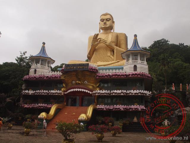 It rained heavily through the night, but when I step out of my cabin, it’s dry. Today I’m traveling from Sigiriya to the hilly region of Kandy. After about an hour’s drive, I arrive in Dambulla. In Dambulla, there are five Buddhist cave temples. Right at the entrance, I see a fifty-meter-high golden Buddha statue. It’s impossible to miss. The statue stands atop a museum building, giving the whole display a somewhat kitschy feel.