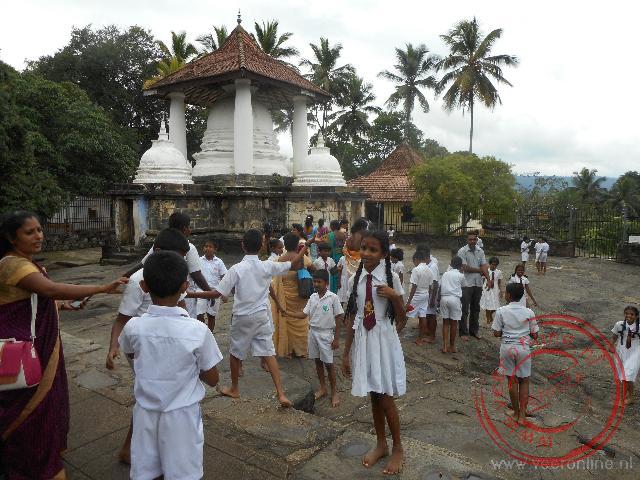 The route winds over narrow roads and through small villages. He has to ask for directions to the Kataragama temple in Embekke a few times. When I step out at the temple, the last man he asked for directions is already beside me. He insists on guiding me around the temple. He tells me about the beautiful and intricate wood carvings of this Hindu temple. The entire temple is made entirely of wood. Meanwhile, Ajbriy has found a local guide for my walk. Satar introduces himself—a somewhat older man who I suspect owns the souvenir shop next to the temple. He leads me along a narrow path toward the second temple. In broken English, he explains that we’ll be walking through the rice fields. I see several people working in the clay, taking a moment to wave at me. In a small village, a monk beckons me to visit his temple as well. His orange robe contrasts beautifully with the small yellow temple. Inside, the temple is simple. There isn’t much money to maintain it, Satar explains. I leave a small donation and show the monk some photos of the Netherlands. He gestures for me to wait and disappears into his house. A little later, he returns with a corn cob—for me! I carefully eat a small piece and take the rest with me. I thank him warmly and continue my walk. After about an hour, I see the Lankatilake temple rising on a rock to my left. A beautiful sight. I climb toward the temple via a staircase carved out of the rocks. The white structure is stunning. I enter the temple. Inside, it is smaller than I expected. I see a large meditating Buddha and his life story depicted on the walls. While I find each temple magnificent on its own, I notice that they start to look somewhat similar. At exactly eleven o’clock, the Puja ceremony begins, meaning offerings are made to the Buddha. A drum and a shrill flute signal the start of the ceremony. A young monk enters the temple, followed by trays of offerings. Unfortunately, this all happens behind closed doors.
