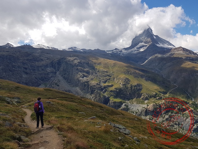 The view of the giant mountains remains magnificent from every angle. After about an hour’s walk, we see the mountain lake. Normally, you would see the Matterhorn reflected in the lake. However, the tall mountain has withdrawn into the clouds. Fortunately, we saw it clearly earlier today. From Riffelsee, we continue walking to Riffelberg. This is the second stop on the cogwheel railway. We decide to keep walking. In a quiet spot, we enjoy our lunch. It’s wonderful to eat our sandwich in nature. Around half past one, we approach the fork between Riffelalp and Zermatt. According to the flyer, the descent to Zermatt takes ninety minutes. We decide to continue down to the valley. We go lower and lower and already see Zermatt in the distance. When we think we’re almost in Zermatt, we see a signpost indicating another one hour and twenty minutes.