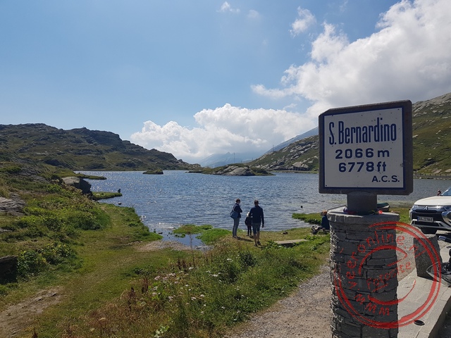 Although the river here is still small and wild, all the water ultimately flows to the Netherlands. On the restaurant terrace, we order something to drink. It is warm in the sunshine. As we continue driving, we soon reach the split between the Bernardino tunnel and the Bernardino pass. We choose the pass. The road winds upwards. Many cyclists are working hard to conquer the mountain. We admire them. This route is also a favorite for motorcyclists. They can go much faster through the hairpin bends. With every bend, we climb higher and higher. At the top of the 2,066-meter-high mountain pass lies the Laghetto Moesola mountain lake. Clearly, we are not alone here.