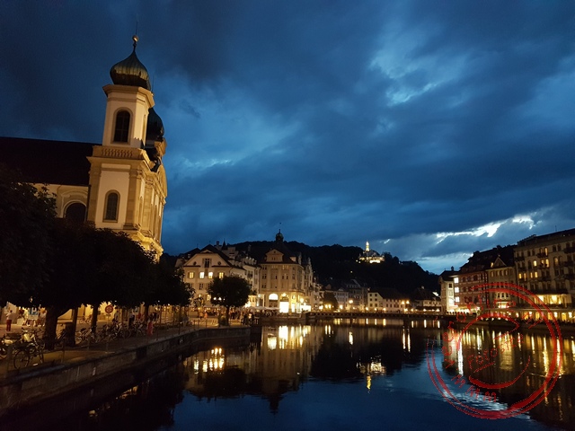 It is warm at night. In the small room there is hardly any ventilation. The air conditioning is set to the lowest level, but this does not lead to lower temperatures. Probably every room’s air conditioning is running, making the capacity insufficient. It is raining outside as we enter the breakfast room. The weather forecast for today is cloudy with occasional showers. To be safe, we take a jacket and umbrella with us as we walk into the city. From the hotel, we received a booklet with a city walk along the highlights of Lucerne. The route starts at the Tourist Info, near the station. The old station building of Lucerne was lost to a fire in 1971. Only the entrance gate was spared. Behind this gate, a new and larger station was built. Lucerne station is one of the five busiest stations in Switzerland. The Kunst- und Kulturzentrum, next to the station, is a combination of a conference hall and museum. The modern building was completed in 1998. The cultural center is located on Lake Lucerne (Vierwaldstättersee). Boats are waiting to take passengers for a cruise on the lake. The lake flows into the Reuss River. Here lies also the Chapel Bridge. This is Switzerland’s main tourist attraction. The covered wooden bridge from 1365 was part of the city’s medieval defenses around old Lucerne. The water tower, part of the bridge, dates from 1300. The bridge has been restored several times. The last restoration was after a fire in 1993 destroyed two-thirds of the bridge. The bridge was restored to its original state, but many historic paintings under the roof of the bridge were lost forever. The fire started on a boat moored nearby. Since then, mooring at the bridge has been prohibited. At the quay, a market is taking place. We walk between the stalls to the Jesuit Church. The Jesuits settled in Lucerne in 1573 in response to the Protestant Reformation in predominantly Catholic Switzerland. On the bank of the Reuss River, they built a baroque Catholic church in 1667.