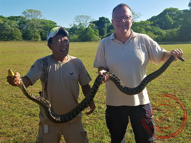 I wake up early. Before sunrise, I can already hear the birds making noise in the trees. The wildlife is slowly coming back to life. During breakfast, Gino walks in. An anaconda snake has been spotted behind the farm. Would I like to see it? Outside, I find Fabio proudly holding the young anaconda in his hands. The anaconda is the largest species of snake in the world—not in length, but in weight. A fully grown anaconda can reach up to eight meters long and weigh over 200 kilos. Fabio asks if I want to hold it. He carefully holds the head, I hold the middle and the tail. I feel the muscles moving, and with its tail, the animal tries to wrap around my arm. A bite from an anaconda is not poisonous, but its sharp teeth hold the prey tightly. The prey is strangled by the body.