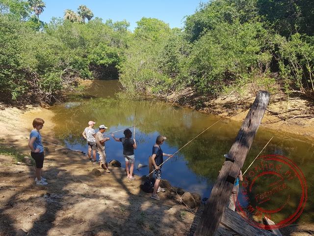 The snake can easily eat animals much larger than itself. Its jaw can open 180 degrees. The snake does smell bad. I quickly wash my hands with soap. Today is the last day in the Pantanal. Each group does the activity they haven’t done yet. I have not yet fished for piranhas. These predatory fish swim in the river behind the farm. I follow Fabio to the water. He has a stack of bamboo fishing rods. At the water’s edge, he attaches a piece of meat to my hook. I cast the bait into the river. Across the water, a few caimans watch me with their eyes just above the surface. Maybe they are hoping for any fish that might get caught. I don’t have to wait long. I feel the line being pulled. The bait is eaten from the hook. Some fish are too clever. Fabio puts on a new piece. Several times, the meat is nibbled. Suddenly, I feel a stronger pull. I reel in the rod and a small fish hangs from the hook. I’ve got a bite! I quickly take a photo with the catch. “A Piau fish,” says Fabio. A fish often served in restaurants. One of my travel companions hooks a piranha. Carefully, Fabio removes the hook from between its sharp teeth. The fun thing about fishing here is you don’t have to wait long. Almost immediately the bait is nibbled. I catch a second fish—a predatory fish. By now, the group has three fish on the shore. “We will feed the caimans with these after we’re done,” Fabio explains. Every next fish is released again.