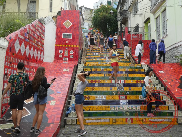 A few blocks from the hotel is Rio by Bike, run by some Dutch people who organize bike tours through the city. We ride through the city in two groups. Marco takes me along. He met a Brazilian woman and has now lived in Rio for seven years. Right at the start something goes wrong—my rear tire is flat. Marco quickly swaps the bike. Now we can set off. During the 2016 Olympic Games, bike lanes were installed all over the city. A separate lane sometimes alongside the road, sometimes on the sidewalk. The paths are nice, Marco sighs, but they forgot to install traffic lights for cyclists. When the car traffic stops, we can go. After two tunnels under the Morro São João hill, we arrive at the Cemitério São João Baptista cemetery. From the cemetery, the surrounding favelas are clearly visible—the slums built against the steep hillsides. Marco explains that although these poor neighborhoods have a nice view over the city, there are hardly any facilities. There is no sewage system. He also says that drug gangs rule the neighborhoods. The police crack down hard in these areas. They do not hesitate to shoot immediately if they suspect armed gang members. Recently, the police have even opened fire from helicopters above the neighborhoods. This is why, Marco continues, they have stopped doing tours in the favelas. Safety cannot be guaranteed one hundred percent. In the cemetery lie wealthy and important residents. Family graves are richly decorated. At the edges are graves for poorer residents, which are cleared after three years. Via the bay of Passrela, we ride toward the historic center. The beaches here are less popular, Marco explains. The water in the bay is polluted due to industry and discharges. During the Olympics, the water was rejected as a venue for competitions. In the park between the water and the buildings, it’s busier. A music stage is being set up, people exercise or enjoy the sun. In the old center is Cinelândia square. There used to be several cinemas here, which is how the square got its unofficial name. A market is being set up in front of the town hall, somewhat blocking the view of the colorful Theatro Municipal from 1909. When demonstrations occur in Rio, they always happen in this square. The streets around the square look busy and messy. Not for nothing does Marco warn to come here only when it is busy. At night and on weekends, it is not safe. At the colored stairs (Escadaria Selarón), I get off. I lean my bike against the wall. “Do I need to lock the bike?” I ask. “No, this is not Amsterdam,” Marco says laughing. Artist Jorge Selarón started tiling the stairs in front of his house in 1990 with leftover materials.