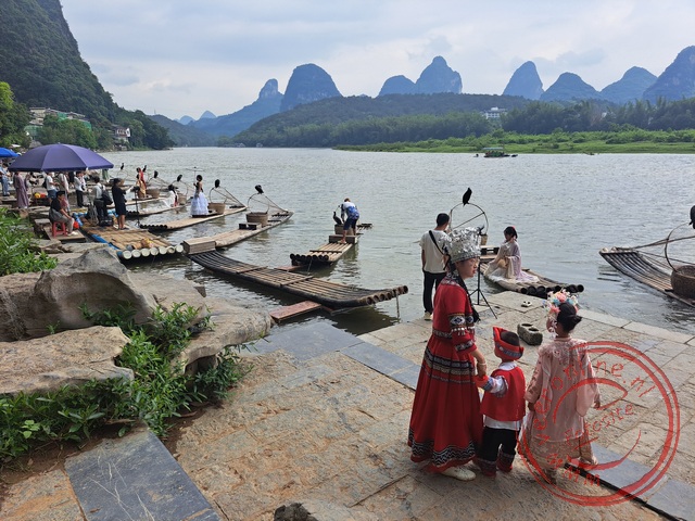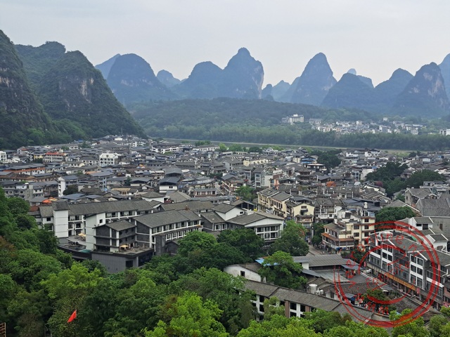Het New West Street Hotel is een groot hotel met kamers verdeelt over acht verdiepingen. Op de eerste verdieping wordt het ontbijtbuffet geserveerd. Er zijn twee restaurants. Eén voor het Chinese ontbijt en één voor een meer westers ontbijt. Ik neem een omelet, toast, koffie, jus d’orange en yoghurt. Buiten zie een klein tempeltje op een steile rotspunt in het park aan de overzijde van de straat. Na het ontbijt wandelen we het park in. Mannen spelen kaart en Chinese schaak onder de bomen. Zij gebaren dat we om de rots moeten lopen voor de beklimming naar het tempeltje. Een smalle stenen trap leidt naar boven. Vanaf de top van de ongeveer zestig meter hoge berg, heb ik een mooi uitzicht over Yangshou en de achterliggende Karst bergen. Een mooi gezicht. In het park beklimmen we ook een tweede rots. Dit uitzicht is minder spectaculair. Aan de achterzijde ligt de Bilian Cave. Een grote Boeddha staat voor de grot. Het hek is afgesloten en het ticketoffice ziet er naar uit dat het de afgelopen vijf jaar niet open geweest is. We wandelen verder naar West Street. Waar het gisterenavond zo druk was, heerst nu een relatieve rust. De eerste winkeltjes openen hun deuren. Restaurants proberen klanten over te halen om op hun terras plaats te nemen. We komen uit bij de Li rivier. De Li-rivier is beroemd om haar landschap met karstbergen, mistige pieken en traditionele vissers met aalscholvers. Meisjes in traditionele kleding laten zich fotograferen op een bamboevlot met een aalscholver en de grillige bergen op de achtergrond. Wij gaan op zoek naar goede koffie. Net wanneer we een cafeetje gevonden hebben en op de veranda aan de koffie zitten, breekt een korte hevige bui los.