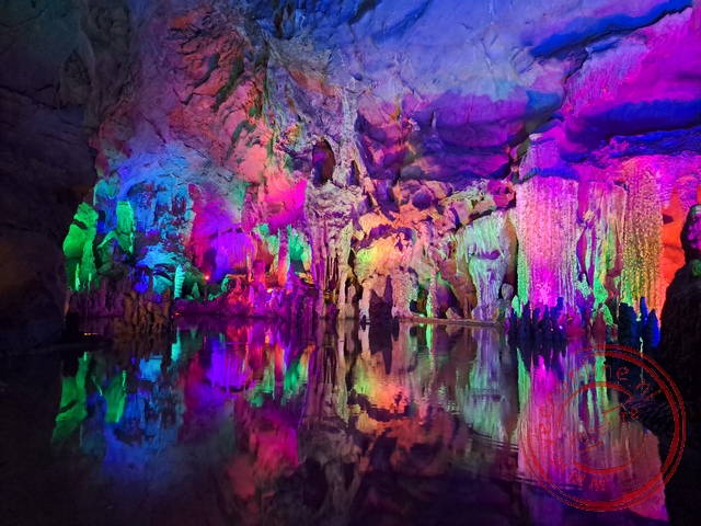 We gaan het meemaken. De chauffeur geeft aan dat we weer in de tuktuk moeten stappen. We hebben al afgerekend bij hem. Hij rijdt ons nog even naar de ingang van de grotten. Met behulp van een omstander, informeert hij of hij moet wachten voor de terugweg. Dit hoeft niet. We zijn van plan om lopend de tien kilometer terug naar Yangshou af te leggen. Dit vertellen we hem maar niet, want dit vindt hij waarschijnlijk veel te ver. De tour in de grotten begint. Een gids met een microfoontje en versterker gaat ons voor de grot in. Ze praat onafgebroken in het Chinees. In de grot bevinden zich prachtige stalactieten en stalagmieten. De indrukwekkende rotsformaties worden echter met felle kleuren uitgelicht. Dit geeft de atmosfeer een kermisachtige aanblik. De Chinezen vinden het prachtig. De felle kleuren weerspiegelen in het water. Los van de kleuren zijn de rotsformaties een prachtig gezicht. De gids loopt voor ons uit. Het lijkt niet zo erg dat de groep niet bijeenblijft. Dit geeft ons de mogelijkheid om foto’s te maken. Enkele Chinese kinderen vinden het leuker om ons te bekijken. ‘Hello’ en ‘Ni hao’ klinkt het voortdurend. Aan het einde van de tour komen we bij de modderbaden. Niemand waagt zich in de drab. Ook bij de hotspring is het rustig. Ik overweeg even om er met mijn onderbroek in te gaan, maar ik heb geen handdoek bij me. Zeker omdat we nog een stuk willen wandelen, is dit niet zo handig. Ik trek mijn schoenen uit en stroop mijn broekspijpen op. Tot net voorbij mijn knieën stap ik in het warme water.