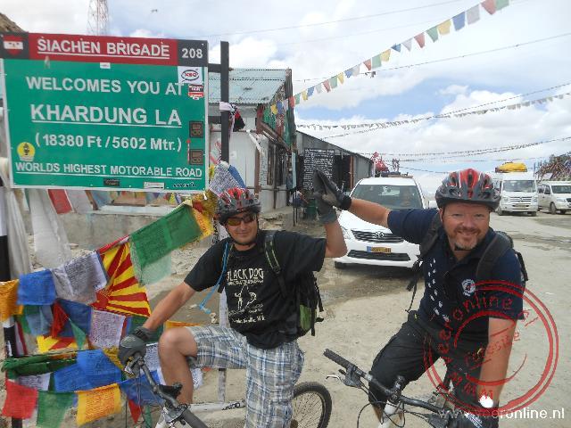 Ook zoek ik een passende helm uit. Met zes andere deelnemers stap ik in de wagen. De fietsen zijn op het dak gebonden. Het gezelschap bestaat uit twee Israëliërs, drie Britten en twee Nederlanders. Sonnu, de chauffeur, probeert met de auto de weg op te draaien. Tot vier keer toe slaat zijn motor af als hij over een klein randje probeert te rijden. Dit belooft wat voor de bergpas. Onder groot applaus van ons, slaagt hij in de vijfde poging. We rijden de bergpas op. De weg is smal. Regelmatig staan we stil om tegenliggers te laten passeren. Soms kan het maar net. Achter me zie ik Leh steeds kleiner en kleiner worden. Halverwege komt een militair konvooi ons tegemoet. Sonnu wordt gebaard aan de kant te gaan. Er volgt een konvooi met zeker vijftig vrachtwagens de bergpas af. Op vijftien kilometer van de top ligt een checkpoint. Sonnu laat de permits zien bij het controlepunt. Hier houdt ook direct het asfalt op. Een stenen rotsachtige weg vervolgt. Af en toe stroomt een bergbeekje over de weg. Dit wordt nog best een uitdaging straks op de fiets. Buldozers zijn bezig de weg te verbeteren. Waarschijnlijk wordt dit gedeelte binnen enkele jaren ook geasfalteerd. Soms bijna stapvoets rijdt Sonnu de auto over de hobbelige weg. Even over één uur, ruim twee uur later, ben ik op de top van de Khardung La pas. Ik ben op een hoogte van 5.602 meter. Zo hoog ben ik nog nooit eerder geweest. Ik maak enkele foto's op de top. Talrijke kleurrijke gebedsvlaggetjes wapperen in de wind.