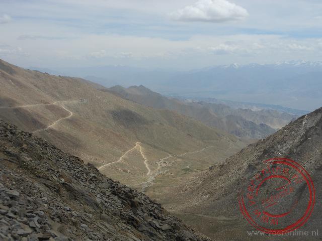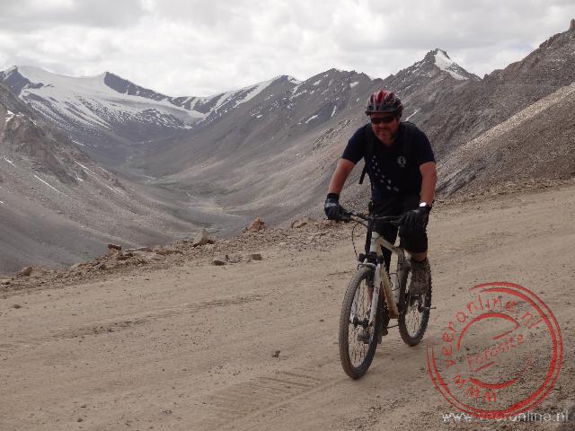 Een mooi gezicht. Na een theetje in één van de hoogste cafés ter wereld, is het tijd voor de afdaling. Ik trek mijn handschoenen aan. Ik zet mijn helm op en ik pak mijn mountainbike. Al direct merk ik dat de weg vol hobbels en kuilen zit. Ik rijd voorzichtig. Ik ben bang dat ik over de kop ga als mijn voorwiel in een kuil komt. Ik moet flink bijremmen om niet te veel snelheid te krijgen. Dit valt mij nog flink tegen. Het prachtige uitzicht maakt alles in een keer goed. Bij de sneeuwresten op de berg stop ik voor een foto. Ik laat direct enkele vrachtwagens passeren. Zij denderen met flinke snelheid van de bergpas. Voor fietsers is weinig plaats. Bij de werkzaamheden haal ik de wachtende auto's weer in. Zij moeten wachten tot de bulldozer klaar is. Ik kan met mijn fiets passeren. Even verderop gaat het mis. Met mijn trapper raak ik een steen op de weg. Ik word met fiets en al gelanceerd. Precies in het zicht van de wachtende auto's. Ik tuimel van mijn fiets en beland hard op de stenen. Gelukkig blijft de schade beperkt tot enkele schaafwonden op been en arm. Ook ligt mijn ketting van de fiets. Ik maak de schaafwonden schoon met drinkwater. Ik zet mijn fiets op de kop en repareer mijn ketting. Iets geschrokken vervolg ik de afdaling. Ik doe nog iets rustiger aan. Al snel komen de vrachtwagens mij weer voorbij. Bij het passeren houd ik even in. Als ik om kijk, zie ik bij de bergtop een groot militair konvooi aan komen rijden. Een uitdaging om dit konvooi voor te blijven. Als ik na vijftien kilometer bij het checkpoint kom, is het net gelukt. Het konvooi stopt bij het checkpoint. Vanaf hier ligt er asfalt. Het afdalen gaat direct een stuk beter en sneller. Op sommige delen hoef ik nauwelijks te remmen. Zorgvuldig vermijd ik de kuilen en het zand op de weg. Bij de bochten rem ik voor de zekerheid iets meer. Ik hang liever niet al te schuin in de bochten. Naar mate ik lager kom, wordt de kwaliteit van de weg steeds beter en is de weg overzichtelijker.