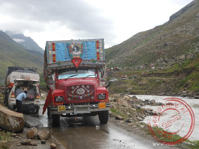 Ik stap uit en wandel langs de wachtende auto's naar de brug. Eén voor één komen de vrachtwagens van het konvooi uiterst langzaam over de brug. De brug kan maar één wagen tegelijk dragen. Aan de rij vrachtwagens lijkt geen einde te komen. Ik schat dat er zeker zestig tot tachtig vrachtwagens voorbij trekken. Ik bestel een kopje thee in een lokaal restaurantje bij de brug en wacht af. Als eindelijk het laatste voertuig gepasseerd is, is het tijd voor het wachtende verkeer. Het duurt nog een half uur voordat mijn auto de brug kan passeren. Ik schat dat ik hier in totaal twee uur heb staan wachten. Snel stap ik weer in en rijd ik de Rothang pas op. De weg omhoog is slecht. Ik zie meer een rotsenpad voor me dan echt een bergweg. Alle vrachtwagens die voor ons over de brug gereden zijn, rijden voor ons op de bergpas. Rasjid toetert volop om aan te geven dat hij in wil halen. Ook als dit naar mijn idee totaal onmogelijk is. Op de bredere stukken passeert hij de vrachtwagens. Helaas voor hem zie ik net onder de top van de Rothang pas enkele yaks op de berghelling staan. Een fotostop. Terwijl ik de yaks vastleg, rijden achter ons de vrachtwagens weer voorbij. Net over de 3.978 meter hoge top van de Rothang pas begint het spelletje inhalen opnieuw. Plotseling zie ik een rij wachtende auto's op de bergpas staan. Wij sluiten ook aan. Door de laaghangende bewolking rond de berg kan ik niet goed zien wat er aan de hand is. Ik stap uit en loop naar voren. Van vrachtwagenchauffeurs begrijp ik uit de gebaren dat verderop een stuk van de weg weggeslagen is door de regenval van vannacht. Ook komen stenen met het regenwater mee naar beneden. Als ik helemaal vooraan sta, zie ik werklui met stenen de weg verstevigen.