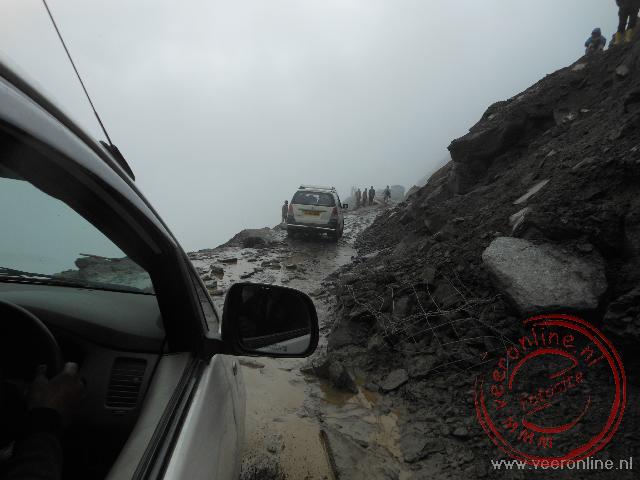 De weg is smal en modderig door de regenval. Vlak er naast klinkt af en toe een geraas van vallende stenen. Ik zie de stenen van een twintig meter hoge rotspunt naar beneden vallen op de weg. Niemand kan er door. Van twee zijden staat het verkeer te wachten. Ik schat in dat dit nog geruime tijd kan gaan duren. Ik loop terug naar de auto en begin aan mijn lunchpakket. Terwijl ik zit te eten komt Rasjid aanrennen. Er wordt aangegeven dat personenauto's langs de rij wachtende vrachtauto's mogen. De weg zou sterk genoeg zijn voor kleinere auto's. Alle personenauto's trekken snel op. Binnen de kortste keren staat alles naast elkaar stil. Niet te hopen dat dit ook aan de andere zijde van de wegwerkzaamheden gebeurt. Toch zie ik heel langzaam schot komen in de wachtende auto's. Eén voor één passeren auto's de smalle strook. Als wij aan de beurt zijn, zie ik een man gebaren dat er hard langs het gevaarlijke stuk gereden moet worden. Waarschijnlijk neemt dan de kans om geraakt te worden door een steen af. Rasjid slipt door de modder en ik hoor stenen tegen de onderkant van de wagen slaan. Zonder problemen passeer ik de landslides. Dit geldt niet voor de achterste auto van onze groep. Bij het passeren raakt een groot rotsblok van 40 centimeter los. Het rolt naar beneden en komt met een harde klap tegen het achterportier. Een flinke schade aan de auto is het gevolg, maar gelukkig zijn er geen gewonden. Iedereen in die auto is flink geschrokken. Achter ons wordt direct al het verkeer weer stilgelegd. De pas is weer dicht. Ik denk dat menig vrachtwagenchauffeur de nacht op de bergpas moet doorbrengen. Wij rijden verder naar beneden. De weg wordt steeds beter naarmate we weer tussen de bomen komen. De hoogte neemt ook snel af. Als we bijna onderaan de bergpas zijn en nog enkele bochten te gaan hebben, staat het verkeer weer stil.