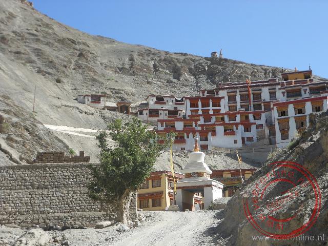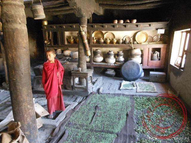 Aan de overzijde besluit ik mijn Teva's aan te houden, omdat ik verderop nog enkele keren door het water moet. Na drie uur wandelen kom ik bij de toegangsweg naar het Rizong klooster. Ik verlaat de beek en trek mijn bergschoenen weer aan. Ik loop verder over de smalle asfaltweg naar het Rizong klooster. Na enkele bochten, zie ik het verscholen klooster tegen de bergen liggen. In het klooster word ik vriendelijk onthaald. Een monnik biedt mij direct thee aan. Ook kan ik een klein beetje van de boterthee proeven. De thee zoals de monniken het zelf drinken. De boterthee heeft een wat vettige smaak van gesmolten boter en theewater. De smaakt is minder vies dan ik verwacht had. Ik had mij voorbereid op de smaak van de Tibetaanse Yak-boterthee. Toch geef ik de voorkeur aan gewone thee. Ik bekijk de prachtige oude keuken van het kloostercomplex. Hier liggen nu de gewassen te drogen. Als ik verder via de trappetjes het kloostercomplex binnen ga, kom ik bij de belangrijkste tempelzaal. In de main hall staan prachtige Boeddhabeelden van het heden en de toekomst. Uiteindelijk kom ik via de trappen helemaal bovenaan in het klooster. Vanaf hier loop ik een bergpad op. Ik hoef dus niet via dezelfde weg weer het klooster te verlaten. Dadul geeft aan dat de route nu ongeveer een half uurtje licht omhoog loopt, en dat daarna een flinke klim naar 3.950 meter komt. Het klooster zelf ligt op 3.300 meter hoogte. Ik loop door een vrij kale vallei.