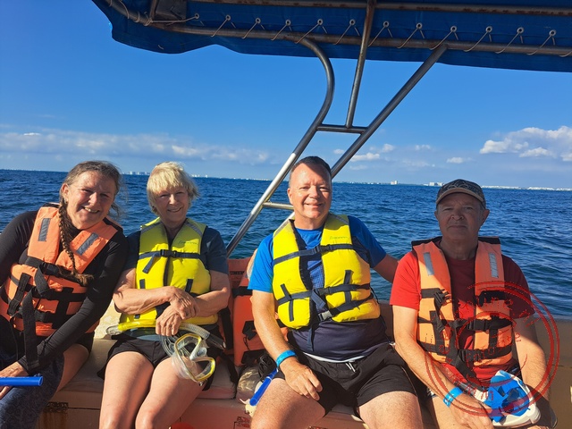 Er zijn acht belangstellenden om te snorkelen. Hoewel dit niet de tien deelnemers zijn, die nodig zijn voor een eigen boot, krijgen we deze toch. Dit komt goed uit, want dan kunnen we al om negen uur vertrekken. Wanneer we met een public boot mee zouden gaan, is het vertrek om elf uur. Om acht uur ga ik naar het ontbijt op de vijfde en bovenste verdieping van het hotel. Koffie, fruit, ei en toast. Een prima start van de dag. Om negen uur ontmoet ik Freddy weer in de lobby van het hotel. Hij begeleidt de snorkelgroep naar de boot in de haven. Hier krijg ik een zwemvest, masker en flippers. Pedro is de schipper. Hij vaart de boot naar de zuidzijde van het eiland. We doen vandaag drie snorkelstops. De eerste stop is bij het ‘museum’. Verschillende betonnen voorwerpen liggen onder water, waar zich in de loop der jaren koraal op gevormd heeft. Er ligt ook een silhouet van een auto. Freddy gaat voor in het water. Hij houdt goed rekening met de stroming, zodat we vooral met de stroom mee kunnen zwemmen. Ik heb wat ruzie met mijn masker. Er loopt meer water in, dan het masker een paar dagen geleden. Ik moet af en toe boven water mijn masker legen. Het koraal en de vissen zijn hier mooier dan in Mahahual. De tweede stop is bij natuurlijke koraal. Tussen het koraal zwemmen mooie vissen. Doordat het water uiterst helder is, is alles goed te zien.