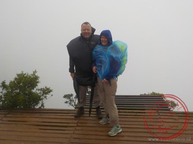 The weather is too bad for a walk. Although I would prefer not to hike in the rain, this area is known to have 200 rainy days a year. I find it hard to believe you can’t hike in the rain. At the top, it’s foggy. Several vehicles are parked with hikers who have already started the trail. I’m going too! I pull a poncho over my head. At the visitor center, my bag is checked. Plastic is not allowed. The labels on my water bottles are cut off, and my packed lunch must go into a paper bag. Although the water is still in the plastic, this raises awareness not to leave plastic behind. I set out for a 9-kilometer circular walk. I start toward Mini World’s End, a viewpoint over a canyon. Along the way, the rain intensifies. The wind over the plateau at the top makes it nearly impossible to use my umbrella. I carefully walk along the sometimes slippery path. Rainwater forms small streams over the trail. A Chinese tourist comes running toward me, looking frightened. He has turned back. From his gestures, I understand that it’s slippery further ahead and requires some scrambling. Although I occasionally step from stone to stone, I find the scrambling quite manageable. Perhaps the tread on my shoes helps. Without much trouble, I arrive at Mini World’s End. Instead of a view, I see a thick mist in front of me.