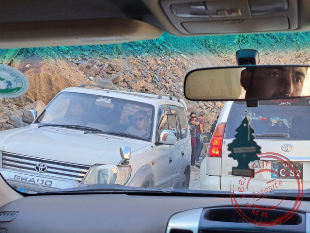 Ik zit vandaag bij Malik in de auto. Hij rijdt de wagen voorzichtig over de rotsachtige weg. Vooral in de bochten is het goed uitkijken dat hij niet te ver naar buiten stuurt, maar ook niet de rotswand raakt. Alles gaat goed. Hij grapt dat het goed is dat ik in de eerste auto zit. De andere auto’s rijden in het stof. De vallei waar we doorheen rijden is adembenemend mooi. Over de route is niets te veel gezegd. De auto past maar net op de weg. Op sommige punten zijn stenen afgebrokkeld. Malik ontwijkt deze plekken zorgvuldig. De eerste brug die we passeren is nog niet ‘de brug’. Het wegdek van de hangbrug beweegt mee met het gewicht van de auto. Het zal allemaal kunnen.